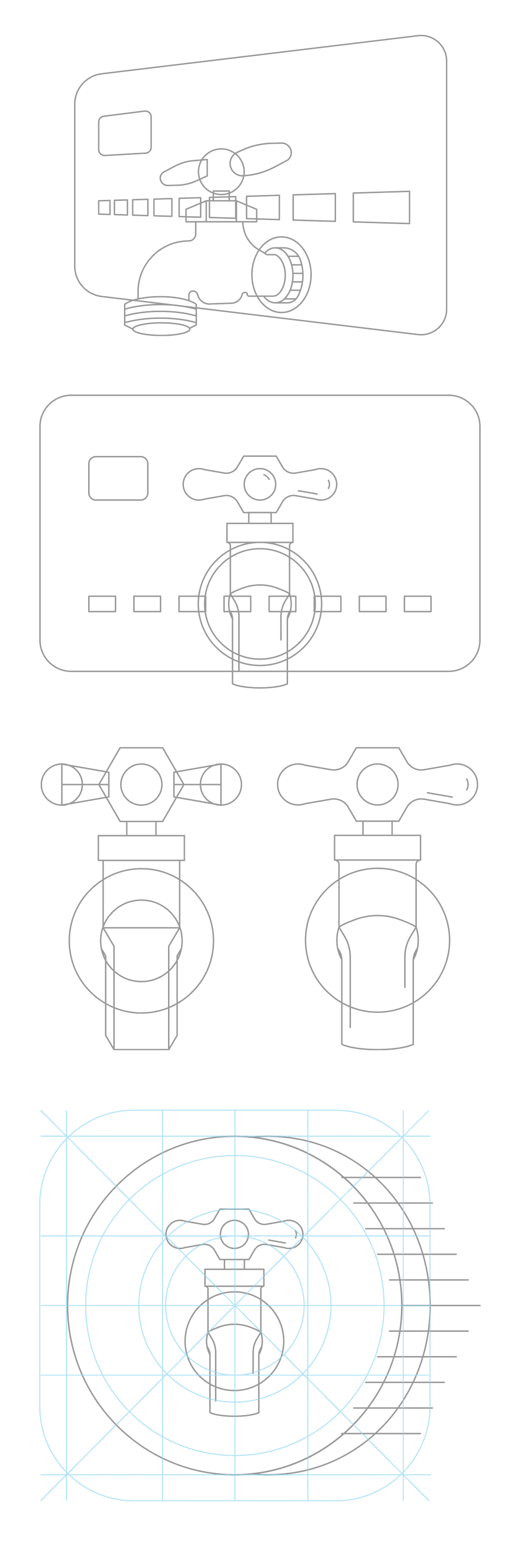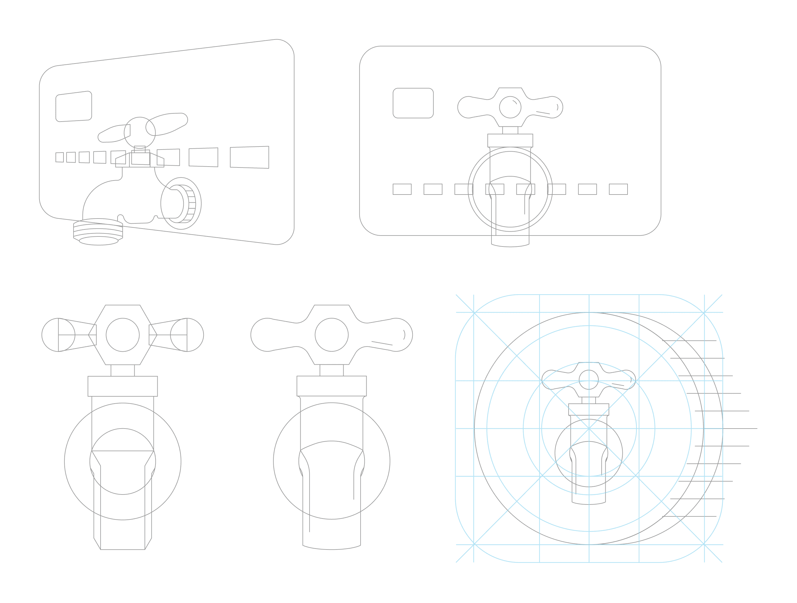 Iterations culminated in a structured, grid-based concept: a faucet embossed on a coin.